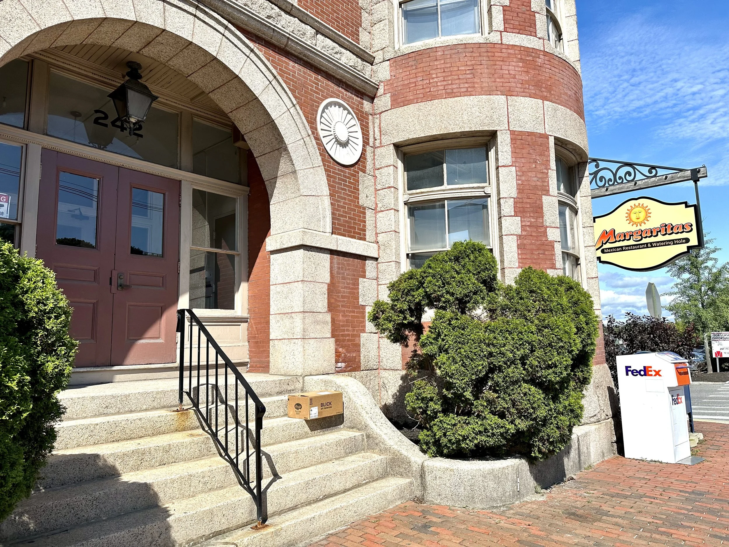 My studio address is 222 St. John St. Portland, ME, but you'll want to enter through the door that says 242. I'm on the first floor (directly above the restaurant Margarita's) in suite 142. Make sure to enter through this door specifically (see photo) because ongoing construction at the building has limited access to my studio from certain directions. There is parking next to and behind the building, as well as on St. John St. Call or text me if you get lost (207-899-6972).