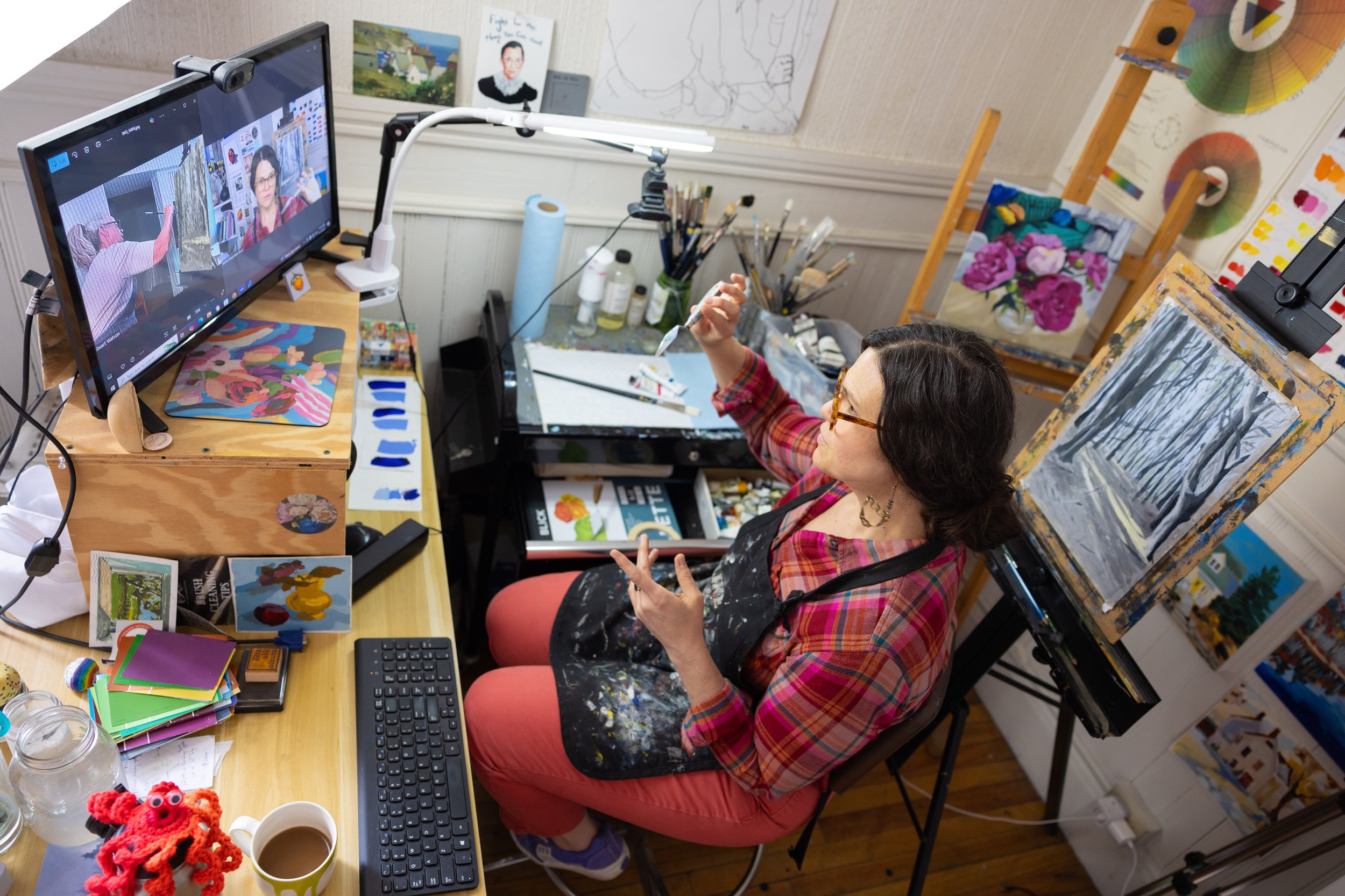 Technology: In the studio you’ll need ZERO, it’s a great break from technology! For online lessons you’ll need a strong internet connection and a computer/laptop with a built-in or external/usb camera. I need to be able to see your face and your studio setup/canvas, but not both at the same time (one camera is enough). You do not need a Zoom account (unless you want one), you can just follow the link I send you.