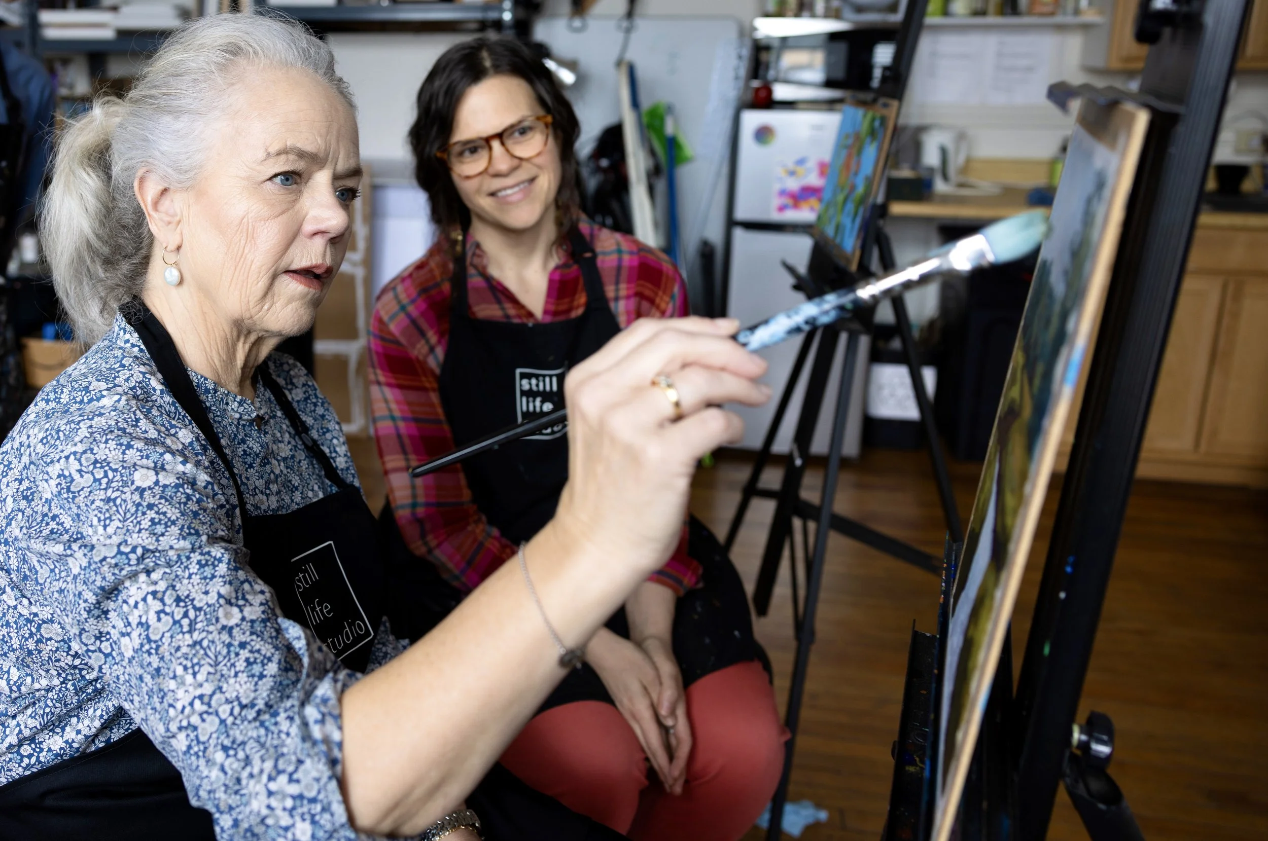 Want to share your lesson with a friend? Shared lessons are offered for up to 3 students who have similar experience levels/interests, who start lessons at the same time, and who come together (I don’t assign painting partners). The rate for shared lessons is $600pp for the 6 hour package.